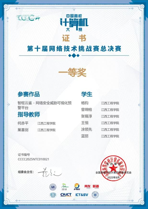 2025年赛事以“数智赋能,安全护航”为主题,聚焦网络技术、人工智能与安全领域的深度融合,吸引全国405所知名本科院校3021支队伍的14345人次报名参赛,集中展现了我国本科高校在网络技术创新创业教育领域的顶尖水平。本届大赛自3月启动以来,在何赤平、巢喜剑老师精心指导下,经过区域赛、挑战赛层层选拔,决赛现场精彩纷呈,在140支队伍的龙争虎斗中,我院以杨钧同学为队长的队伍异军突起,荣获全国一等奖,展现了非凡的计算机和工程实践创新能力。