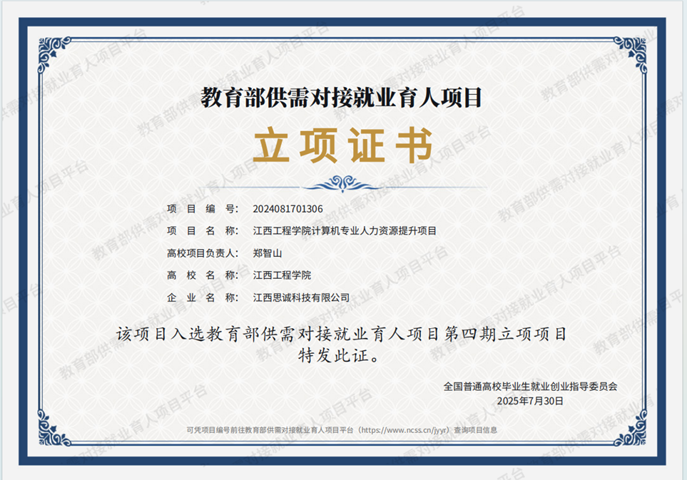 近日,全国普通高校毕业生就业创业指导委员会正式公布了2025年第四期供需对接就业育人项目立项名单,由我校人工智能与数据科学学院郑智山和周丽华两位老师及团队申报的就业实习基地和人力资源提升两个项目正式获批立项。这标志着人工智能与数据科学学院在深化产教融合、精准对接国家战略需求与行业前沿发展方面迈出坚实一步,人才培养与社会需求的契合度进一步提升。